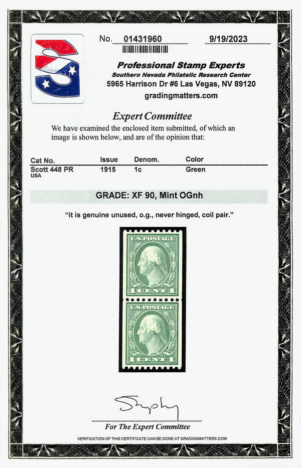 5249 nh 448 image1915, 1¢ green, S.L. watermark, rotary press coil, perf. 10 horizontally (Scott 448), pair, o.g., never hinged, Extremely Fine, with 2023 P.S.E. certificate graded XF 90.