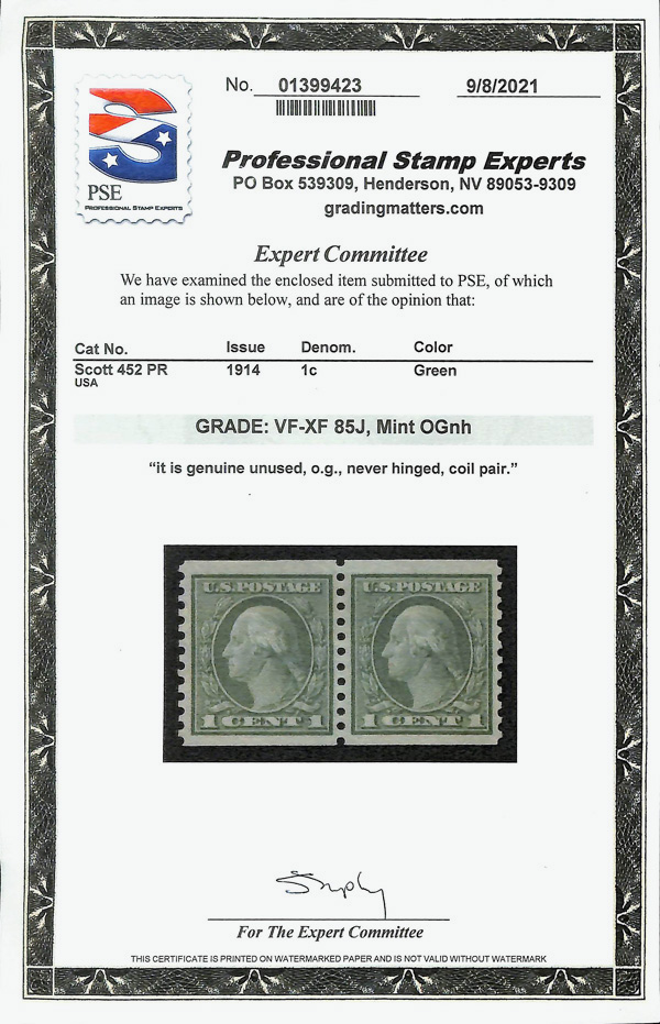 5250 nh 452 image1914, 1¢ green, S.L. watermark, rotary press coil, perf. 10 vertically (Scott 452), pair, o.g., never hinged, jumbo margins, Very Fine to Extremely Fine, with 2021 P.S.E. certificate graded VF-XF 85J.