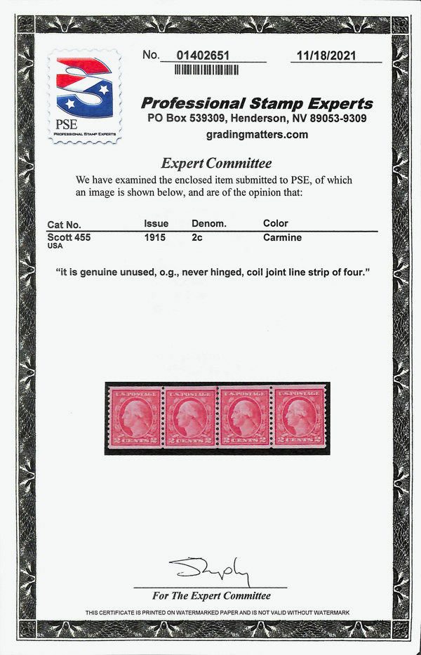 5253 nh 455 image1915, 2¢ carmine, type III, S.L. watermark, rotary press coil, perf. 10 vertically (Scott 455), joint line strip of 4, o.g., never hinged, Very Fine, with 2021 P.S.E. certificate.