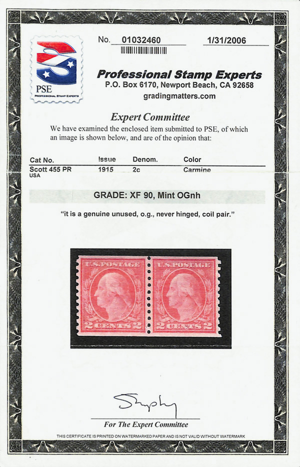 5252 nh 455 image1915, 2¢ carmine, type III, S.L. watermark, rotary press coil, perf. 10 vertically (Scott 455), pair, o.g., never hinged, Extremely Fine, with 2006 P.S.E. certificate graded XF 90.