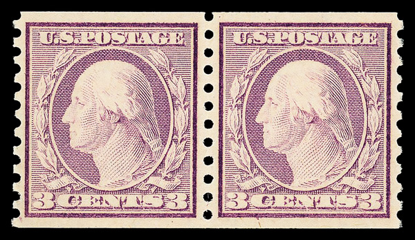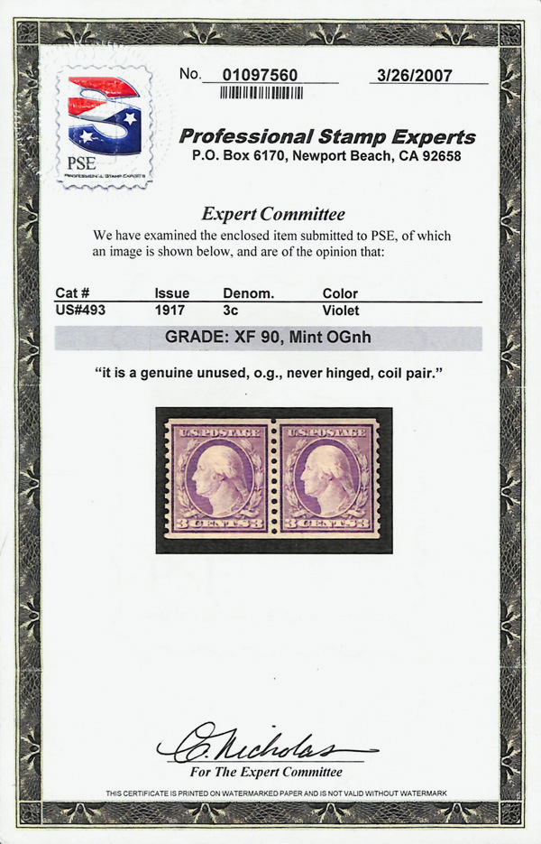 5272 nh 493 image1917, 3¢ violet, type I, unwatermarked, rotary press coil, perf. 10 vertically (Scott 493), pair, o.g., never hinged, Extremely Fine, with 2007 P.S.E. certificate graded XF 90.