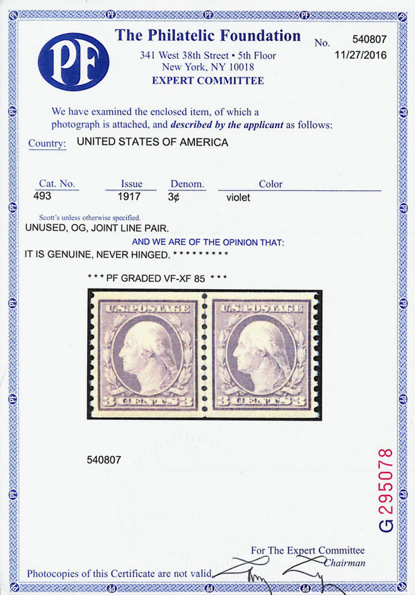 5273 nh 493 image1917, 3¢ violet, type I, unwatermarked, rotary press coil, perf. 10 vertically (Scott 493), joint line pair, o.g., never hinged, Very Fine to Extremely Fine, with 2016 P.F. certificate graded VF-XF 85.