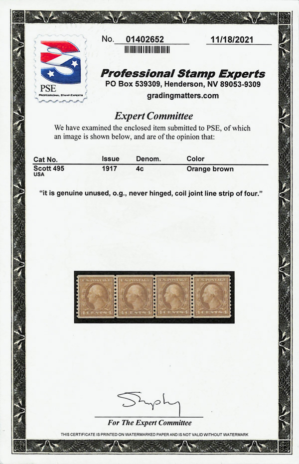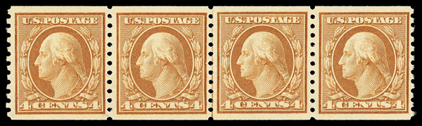 5274 nh 495 image1917, 4¢ orange brown, unwatermarked, rotary press coil, perf. 10 vertically (Scott 495), joint line strip of 4, o.g., never hinged, Fine to Very Fine, with 2021 P.S.E. certificate.