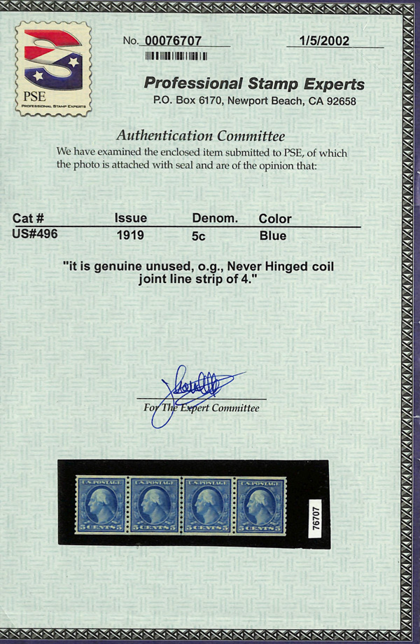 5276 nh 496 image1919, 5¢ blue, unwatermarked, rotary press coil, perf. 10 vertically (Scott 496), joint line strip of 4, o.g., never hinged, Very Fine to Extremely Fine, with 2002 P.S.E. certificate.