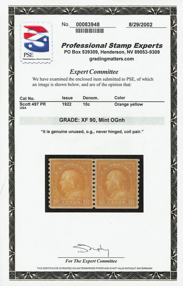 5278 nh 497 image1922, 10¢ orange yellow, unwatermarked, rotary press coil, perf. 10 vertically (Scott 497), pair, o.g., never hinged, Extremely Fine, with 2002 P.S.E. certificate graded XF 90.