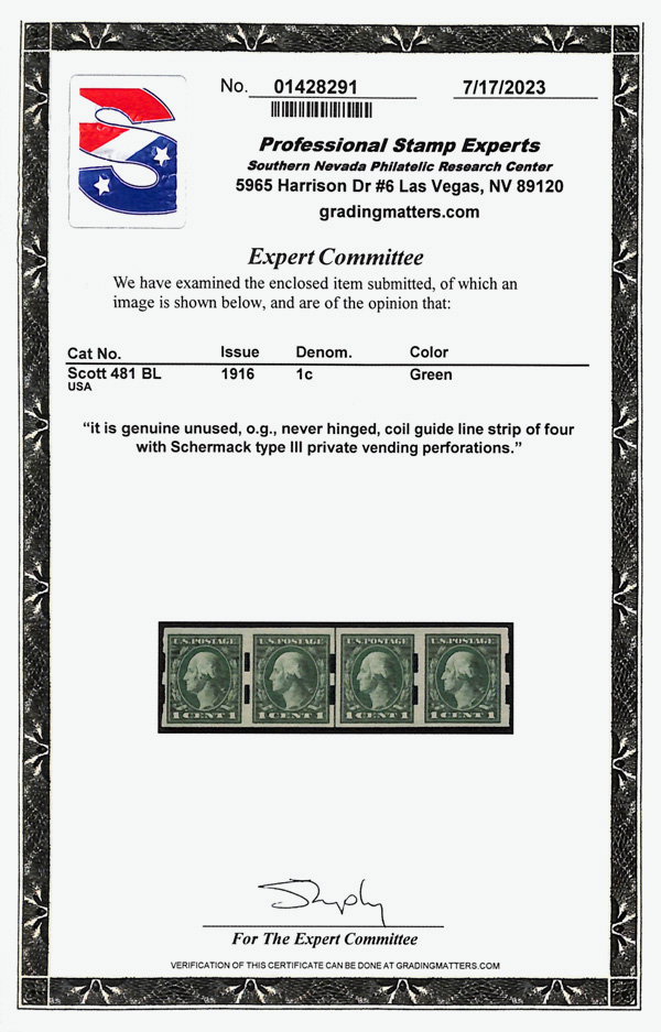 5262 nh 481 image1916, 1¢ green, unwatermarked, imperf. (Scott 481), guide line strip of 4, Schermack Type III private vending perfs, o.g., never hinged, Fine to Very Fine, with 2023 P.S.E. certificate.