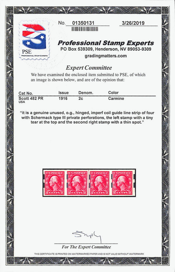 5264 og 482 image1916, 2¢ carmine, type I, unwatermarked, imperf. (Scott 482), guide line strip of 4, Schermack Type III private vending perfs, o.g., hinge remnant (pencil mark on gum), Very Good to Fine, with 2019 P.S.E. certificate.