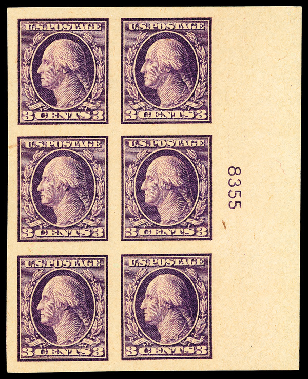5267 ogbl 484 image1916, 3¢ violet, type II, unwatermarked, imperf. (Scott 484), right margin plate block of 6 with plate number 8355, Bright color glowing with freshness, o.g., lightly hinged; a few trivial inclusions, Extremely Fine.