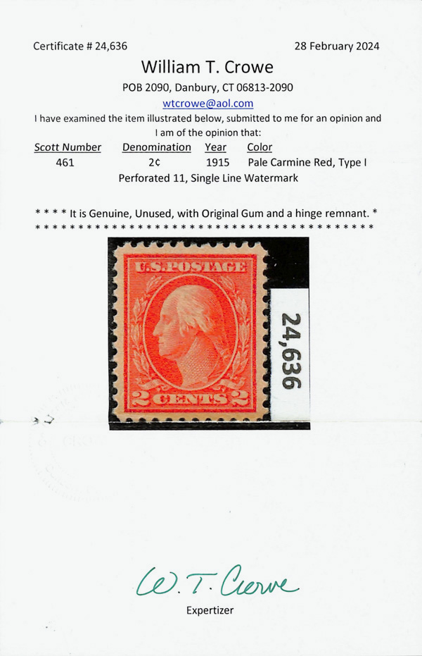 5255 og 461 image1915, 2¢ pale carmine red, type I, S.L. watermark, perf. 11 (Scott 461), o.g., hinge remnant, enticing with radiant color, like-new paper, and superior centering, Very Fine to Extremely Fine, with 2024 Crowe certificate.