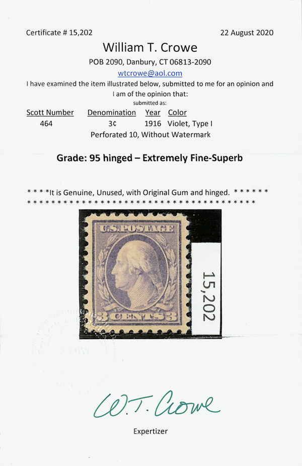 5257 og 464 image1916, 3¢ violet, type I, unwatermarked, perf. 10 (Scott 464), o.g., hinged, in Post Office fresh condition with cool color and crisp detail, Extremely Fine to Superb, with 2020 Crowe certificate graded XF-SUP 95.