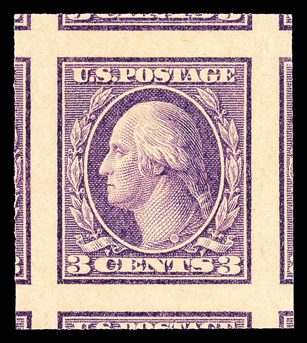 5266 nh 484 image1916, 3¢ violet, type II, unwatermarked, imperf. (Scott 484), o.g., never hinged, a grand jumbo with immense color depth and massive, balanced margins, Superb.