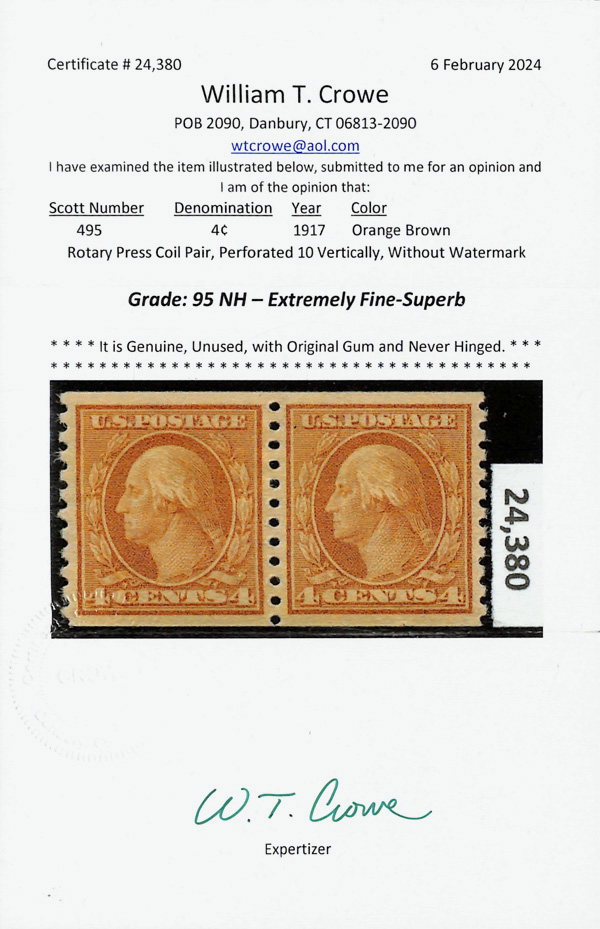 5275 nh 495 image1917, 4¢ orange brown, unwatermarked, rotary press coil, perf. 10 vertically (Scott 495), pair, o.g., never hinged, a beautiful twosome, fresh, bright and mathematically centered, Extremely Fine to Superb, with 2024 Crowe certificate graded XF-SUP 95.