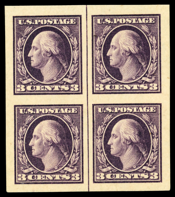 5265 ogbl 483 image1917, 3¢ violet, type I, unwatermarked, imperf. (Scott 483), block of 4 with vertical guide line, o.g., lightly hinged, Superb.