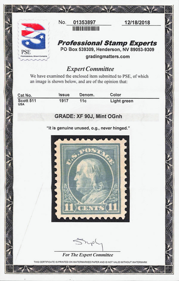 5291 nh 511 image1917, 11¢ light green, perf. 11 (Scott 511), o.g., never hinged, jumbo margins, Extremely Fine, with 2018 P.S.E. certificate graded XF 90J.
