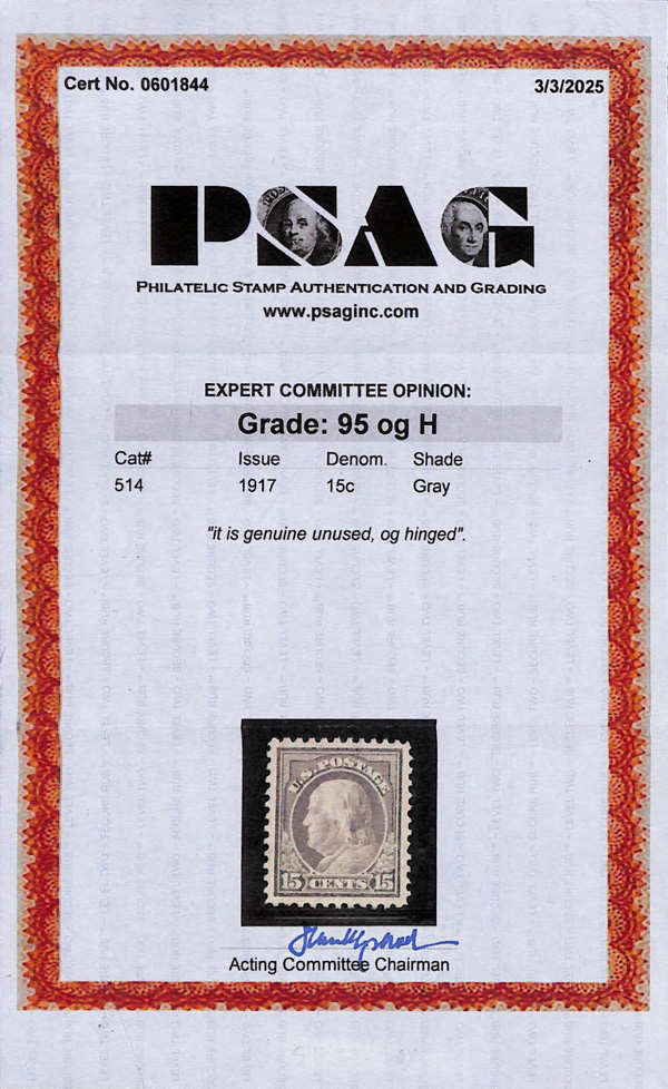 5295 og 514 image1917, 15¢ gray, perf. 11 (Scott 514), disturbed o.g., Extremely Fine to Superb, with 2025 P.S.A.G. certificate graded XF-SUP 95.