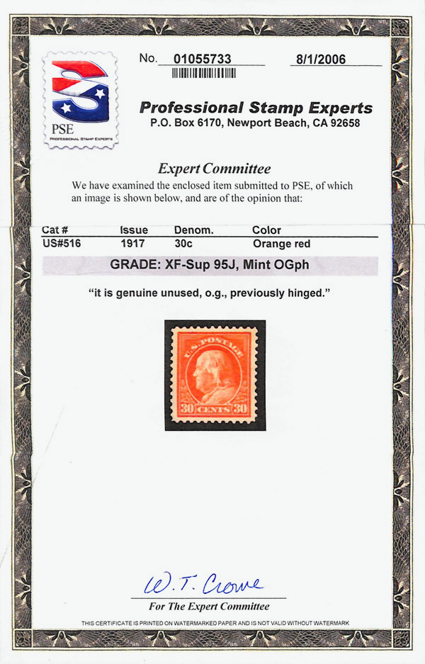 5296 og 516 image1917, 30¢ orange red, perf. 11 (Scott 516), o.g., lightly hinged, jumbo margins, Extremely Fine to Superb, with 2006 P.S.E. certificate graded XF-SUP 95J.