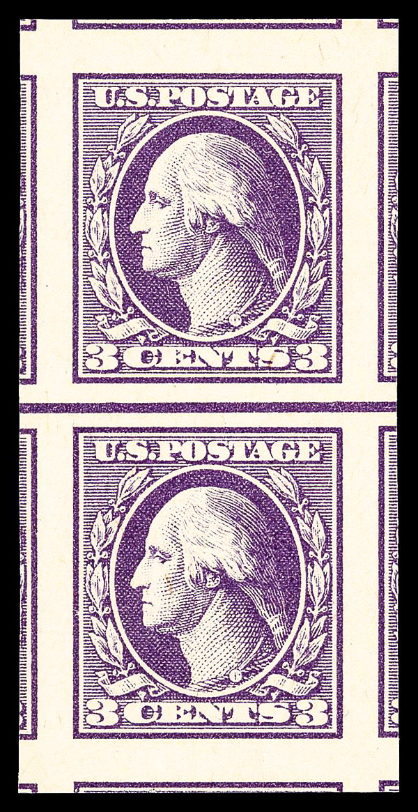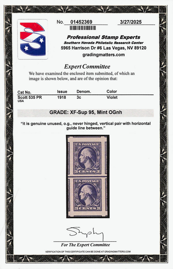 5309 nh 535 image1918, 3¢ violet, type V, offset printing, imperf. (Scott 535), vertical pair with guide line between, o.g., never hinged, Extremely Fine to Superb, with 2025 P.S.E. certificate graded XF-SUP 95.