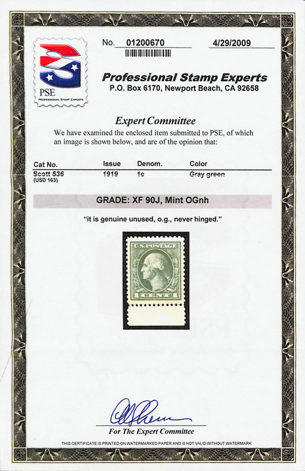 5311 nh 536 image1919, 1¢ gray green, offset printing, perf. 12½ (Scott 536), o.g., never hinged, jumbo margins, Extremely Fine, with 2009 P.S.E. certificate graded XF 90J.