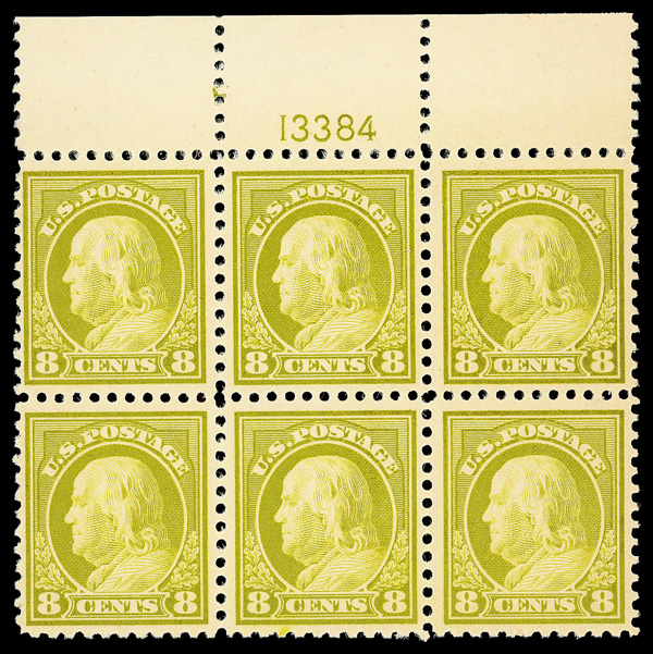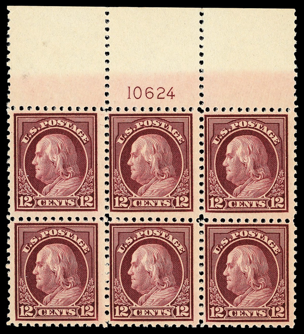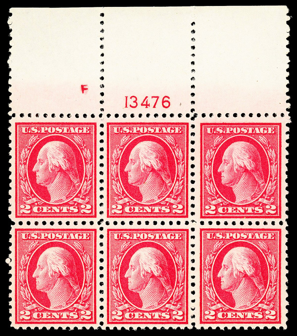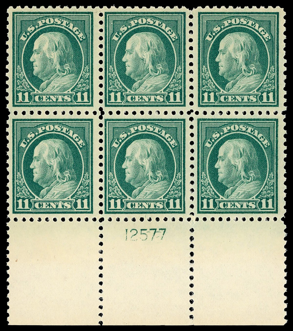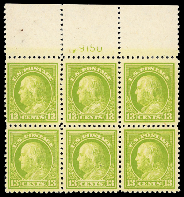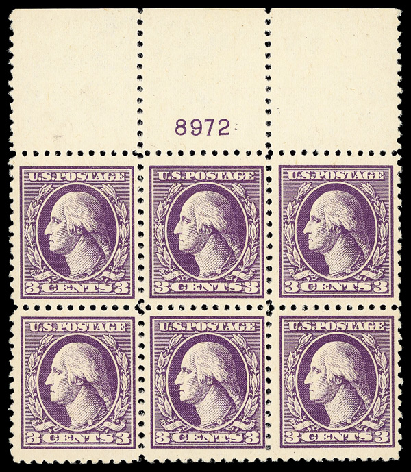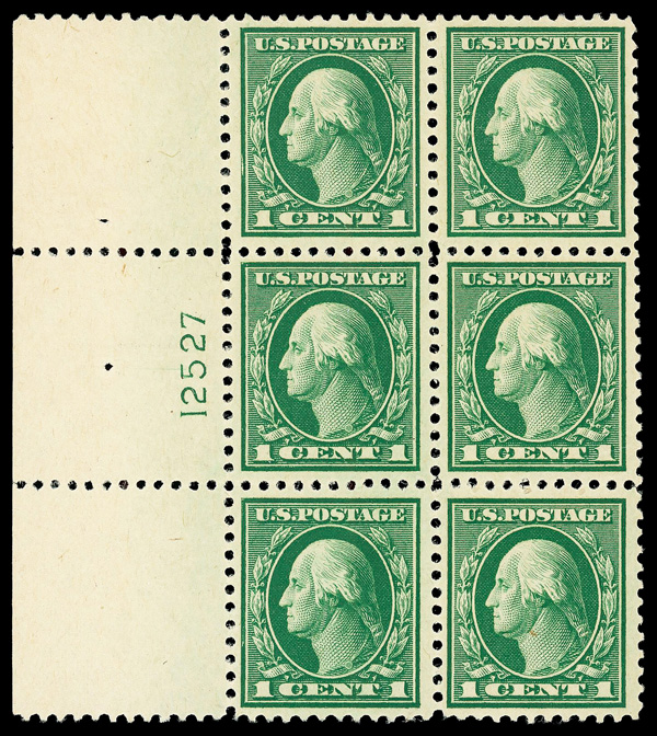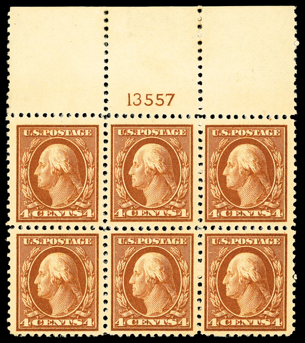 5284 nh/ogbl 503 image1917, 4¢ brown, perf. 11 (Scott 503), wide top margin plate block of 6 with plate number 13557, Fresh, lively printed surface, o.g., right two stamps lightly hinged (4 stamps never hinged), Very Fine.