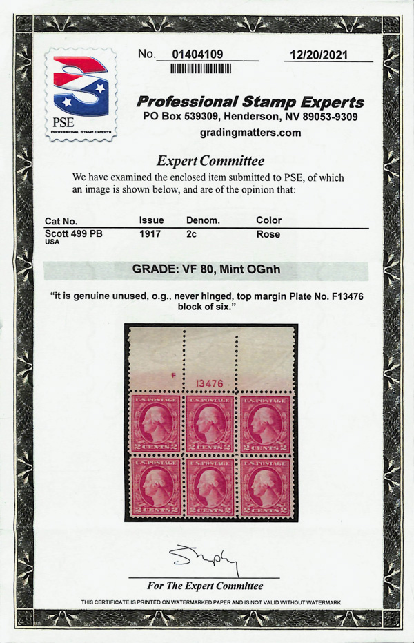 5283 nhbl 499 image1917, 2¢ rose, type I, perf. 11 (Scott 499), plate block of 6, o.g., never hinged, Very Fine, with 2021 P.S.E. certificate graded VF 80.