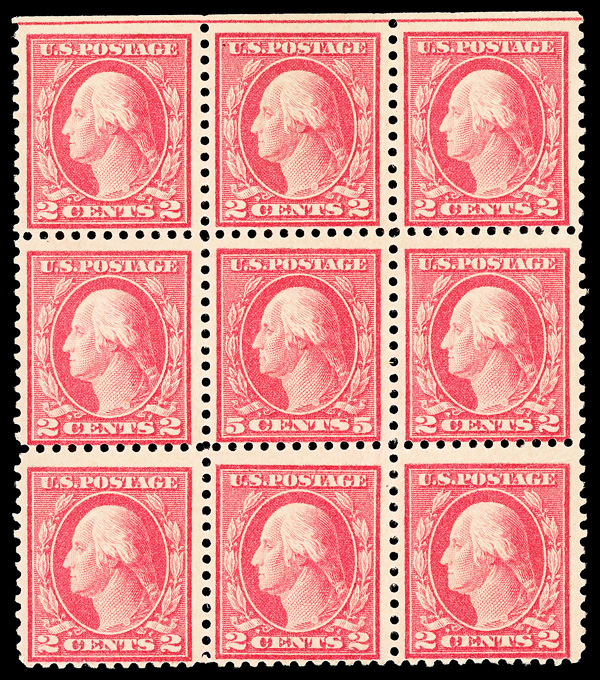 5286 ogbl 505 image1917, 5¢ rose color error, perf. 11 (Scott 505), top margin block of 9, o.g., paper hinge remnant (error NH), Fine.