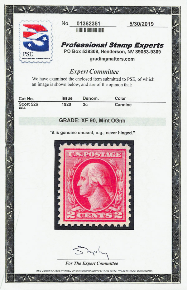 5299 nh 526 image1920, 2¢ carmine, type IV, offset printing (Scott 526), o.g., never hinged, Extremely Fine, with 2019 P.S.E. certificate graded XF 90.
