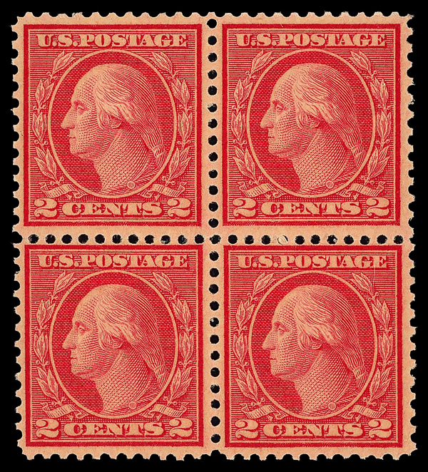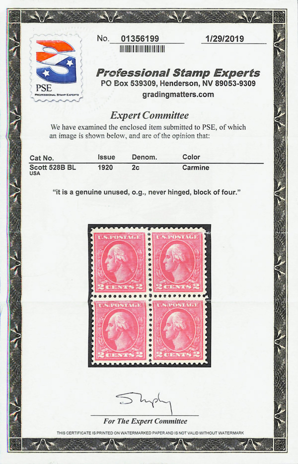 5301 nhbl 528B image1918, 2¢ carmine, type VII, offset printing (Scott 528B), block of 4, o.g., never hinged, Very Fine, with 2019 P.S.E. certificate.