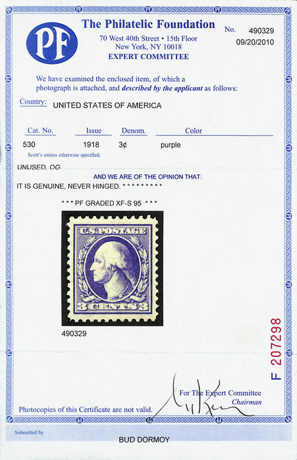 5303 nh 530 image1918, 3¢ purple, type IV, offset printing (Scott 530), o.g., never hinged, Extremely Fine to Superb, with 2010 P.F. certificate graded XF-SUP 95.