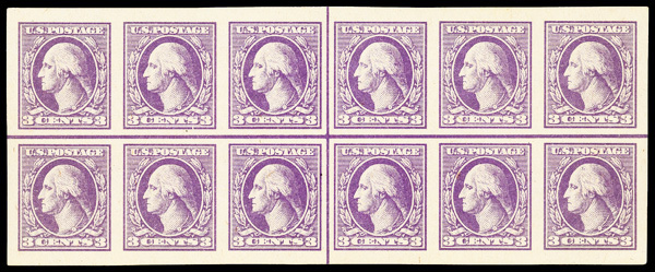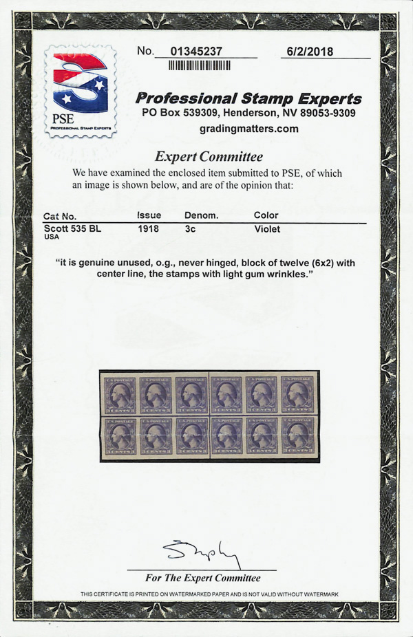 5310 nhbl 535 image1918, 3¢ violet, type V, offset printing, imperf. (Scott 535), horizontal centerline block of 12, o.g., never hinged (minor gum creases), Extremely Fine to Superb, with 2018 P.S.E. certificate.