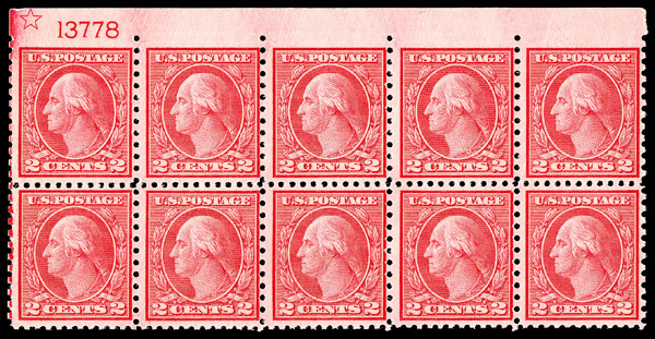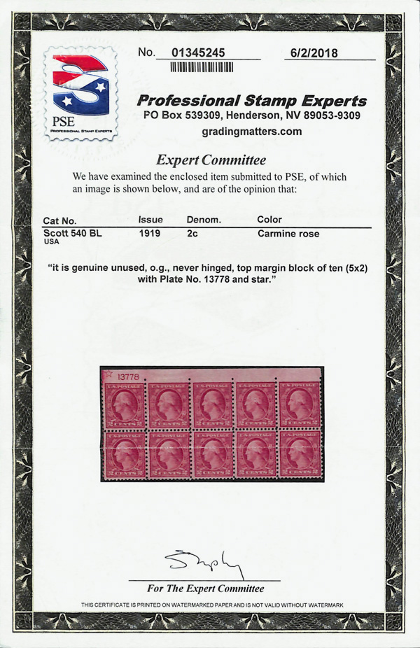 5316 nhbl 540 image1919, 2¢ carmine rose, type II, rotary press coil waste, perf. 11 x 10 (Scott 540), top imperf margin block of 10 with star & plate number, o.g., never hinged, Fine, with 2018 P.S.E. certificate.