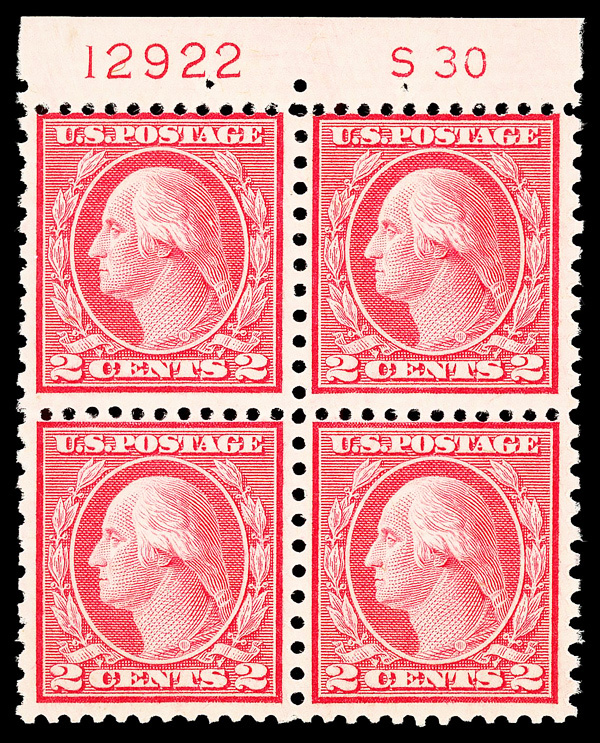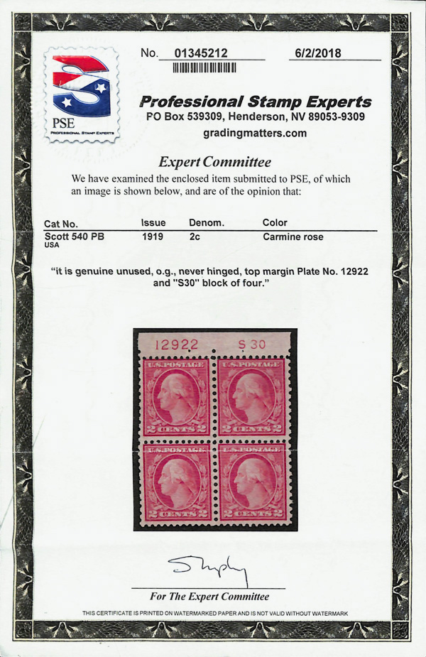 5317 nhbl 540 image1919, 2¢ carmine rose, type II, rotary press coil waste, perf. 11 x 10 (Scott 540), plate block of 4, o.g., never hinged, Very Good to Fine, with 2018 P.S.E. certificate.