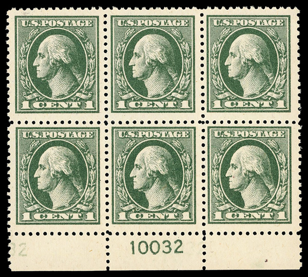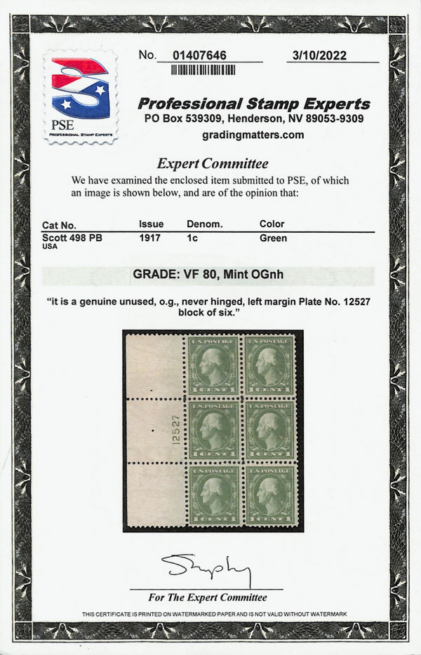 5281 nhbl 498 image1917, 1¢ green, perf. 11 (Scott 498), plate block of 6, o.g., never hinged, Very Fine, with 2022 P.S.E. certificate graded VF 80.
