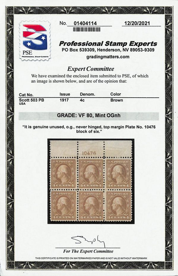 5285 nhbl 503 image1917, 4¢ brown, perf. 11 (Scott 503), plate block of 6, o.g., never hinged, Very Fine, with 2021 P.S.E. certificate graded VF 80.