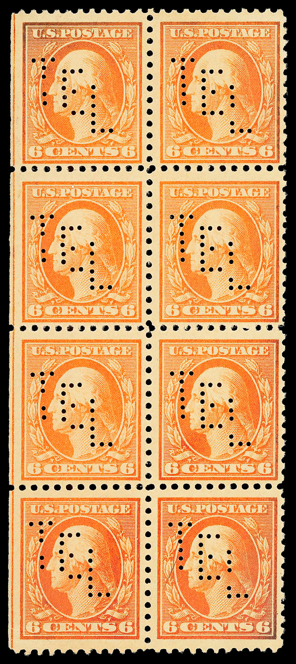 5287 nhbl 506 image1917, 6¢ red orange, perf. 11 (Scott 506), left margin block of 8 with guide line, with descending diagonal 'TEL' perfin, o.g., never hinged, Fine to Very Fine, with 2025 P.S.E. certificate.
