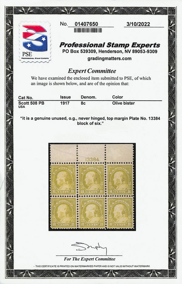 5289 nhbl 508 image1917, 8¢ olive bister, perf. 11 (Scott 508), plate block of 6, o.g., never hinged, Fine to Very Fine, with 2022 P.S.E. certificate.
