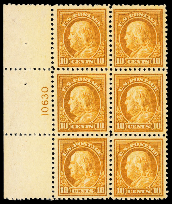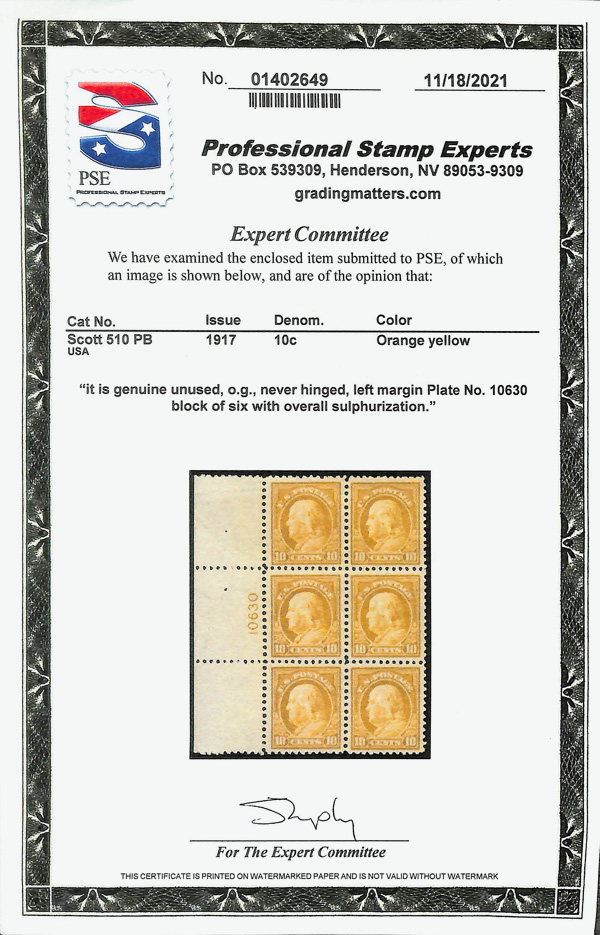 5290 nhbl 510 image1917, 10¢ orange yellow, perf. 11 (Scott 510), plate block of 6, o.g., never hinged (sulphurized), Very Fine, with 2021 P.S.E. certificate.