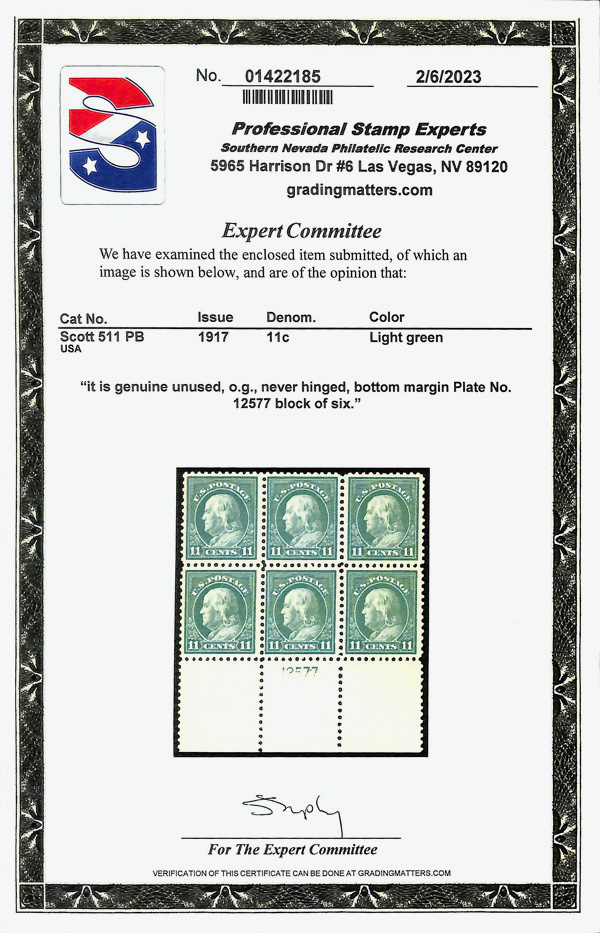 5292 nhbl 511 image1917, 11¢ light green, perf. 11 (Scott 511), plate block of 6, o.g., never hinged, Very Fine, with 2023 P.S.E. certificate.