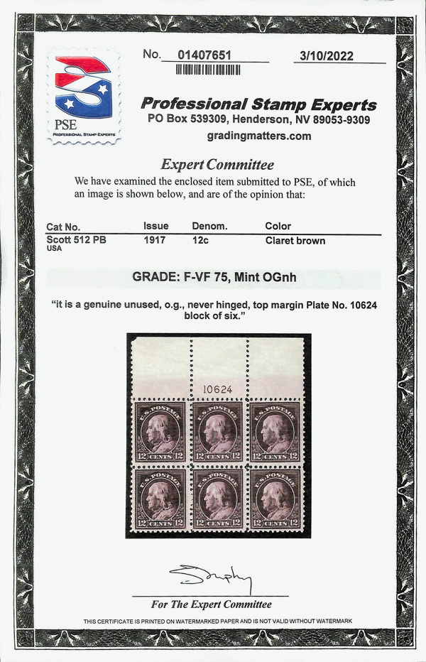 5293 nhbl 512 image1917, 12¢ claret brown, perf. 11 (Scott 512), plate block of 6, o.g., never hinged, Fine to Very Fine, with 2022 P.S.E. certificate graded F-VF 75.