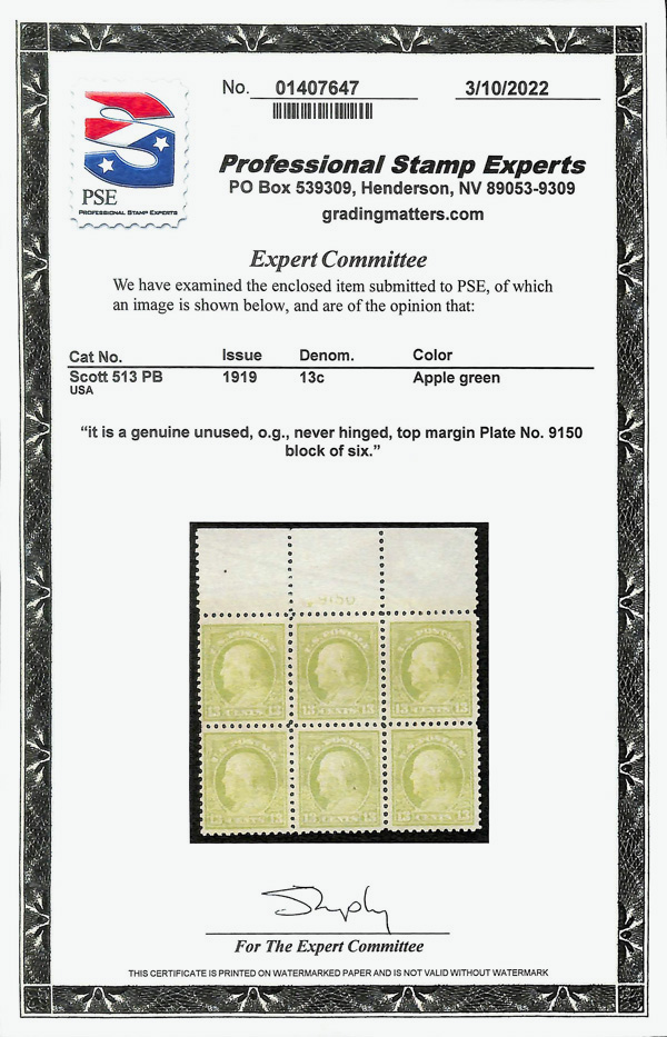 5294 nhbl 513 image1919, 13¢ apple green, perf. 11 (Scott 513), plate block of 6, o.g., never hinged, Fine, with 2022 P.S.E. certificate.