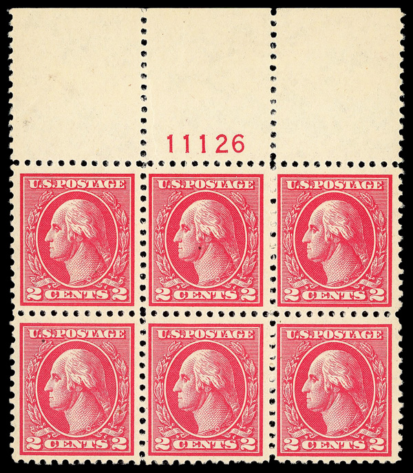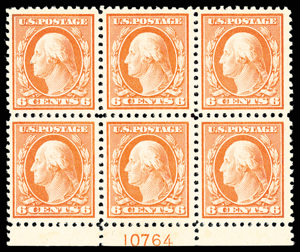 5288 ogbl 506 image1917, 6¢ red orange, perf. 11 (Scott 506), bottom margin plate number 10764 block of 6, o.g., very lightly hinged, Post Office fresh with rich, radiant color on like-new paper, well-centered throughout, Very Fine to Extremely Fine.