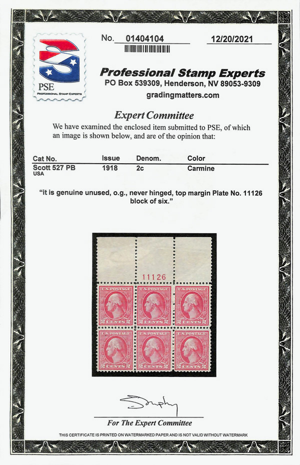 5300 nhbl 527 image1918, 2¢ carmine, type V, offset printing (Scott 527), plate block of 6, o.g., never hinged, Very Fine, with 2021 P.S.E. certificate.
