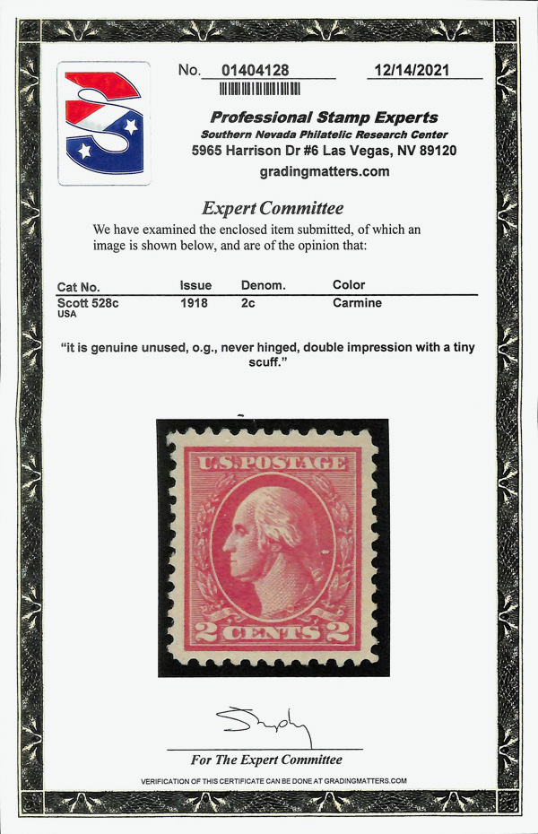 5302 nh 528c image1918, 2¢ carmine, type Va, offset printing, double impression (Scott 528c), o.g., never hinged; tiny facial scuff, Very Fine to Extremely Fine, with 2021 P.S.E. certificate.