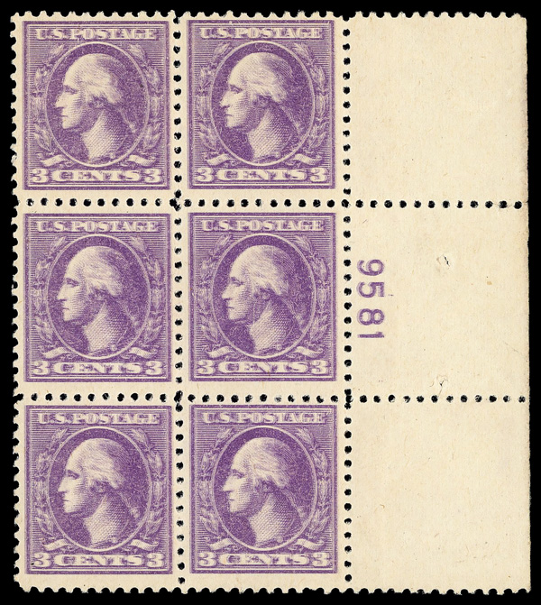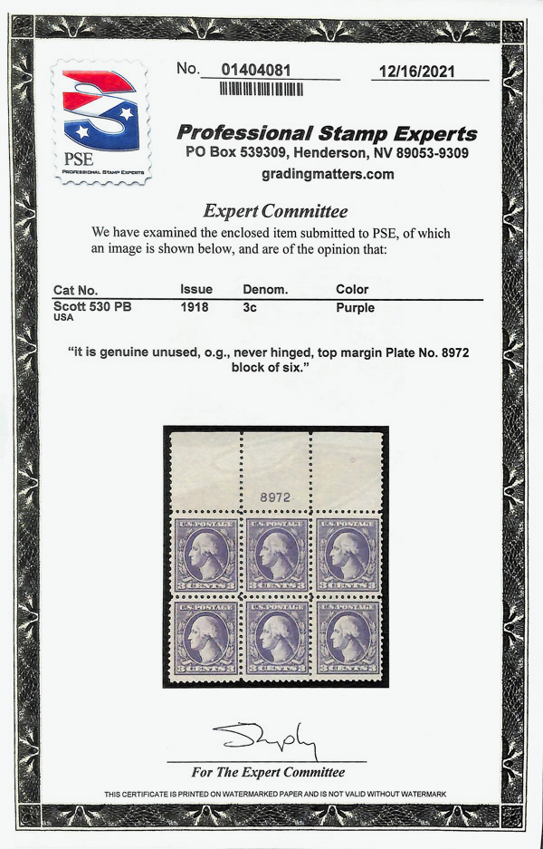 5304 nhbl 530 image1918, 3¢ purple, type IV, offset printing (Scott 530), plate block of 6, o.g., never hinged, Fine to Very Fine, with 2021 P.S.E. certificate.