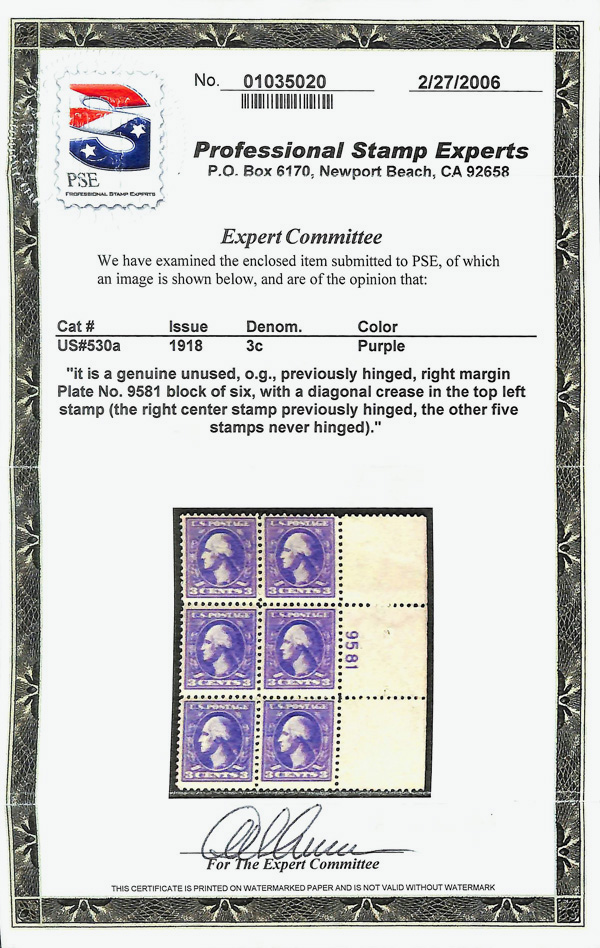 5305 nh/ogbl 530a image1918, 3¢ purple, type IV, offset printing, double impression (Scott 530a), plate block of 6, o.g., hinged (5 stamps never hinged) (gum bend), Fine to Very Fine no Scott value for hinged PB, with 2006 P.S.E. certificate. (Image) (Image2) (All Images)