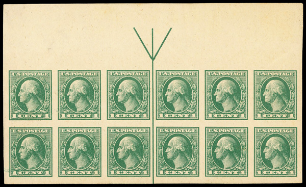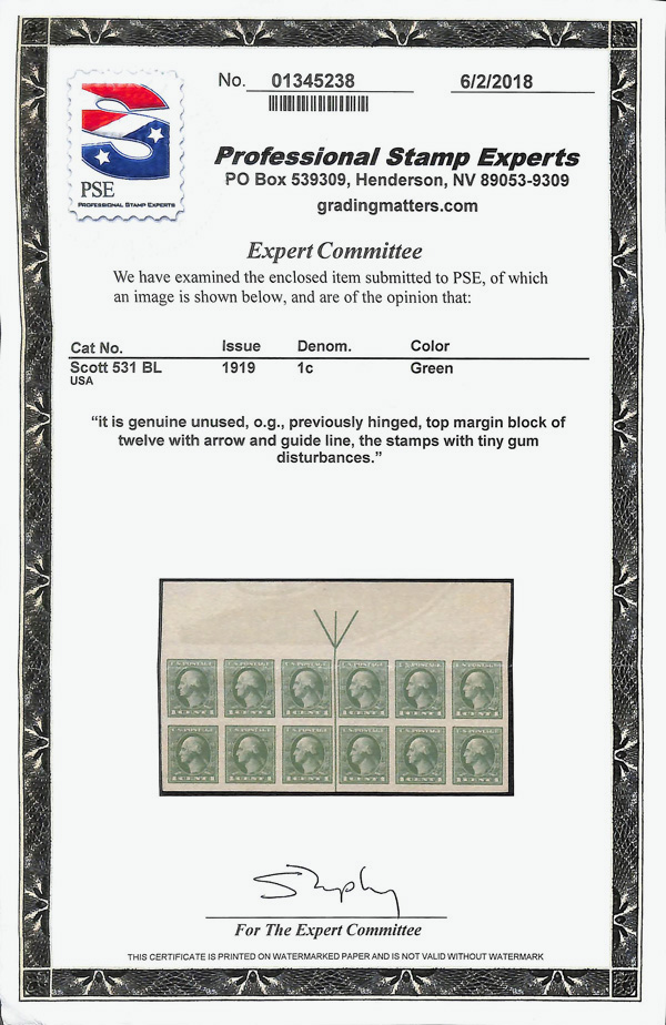 5307 ogbl 531 image1919, 1¢ green, offset printing, imperf. (Scott 531), arrow block of 12, slightly disturbed o.g., Extremely Fine to Superb, with 2018 P.S.E. certificate.