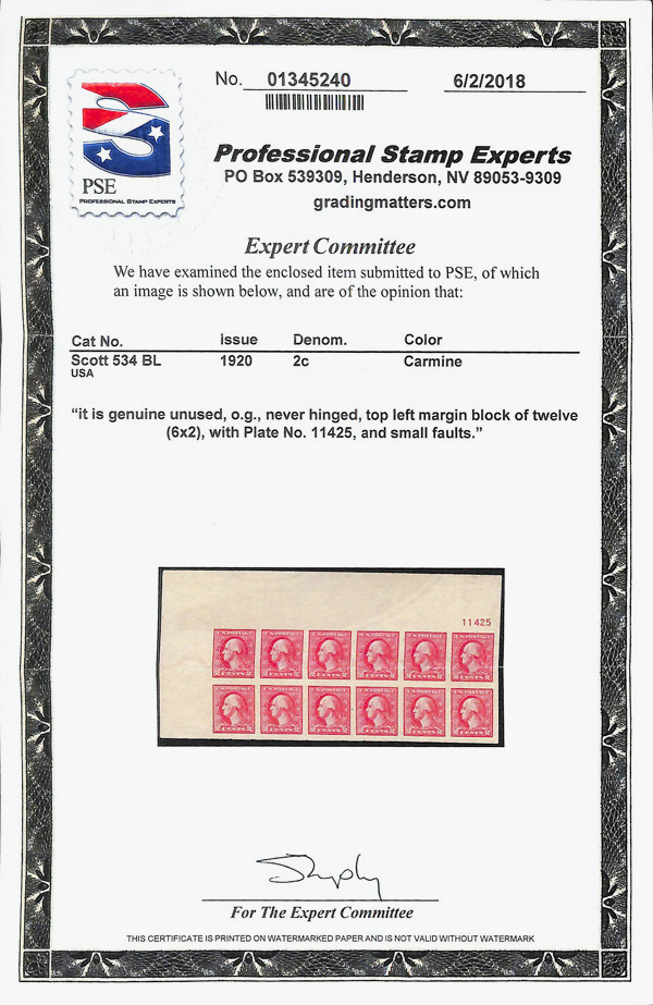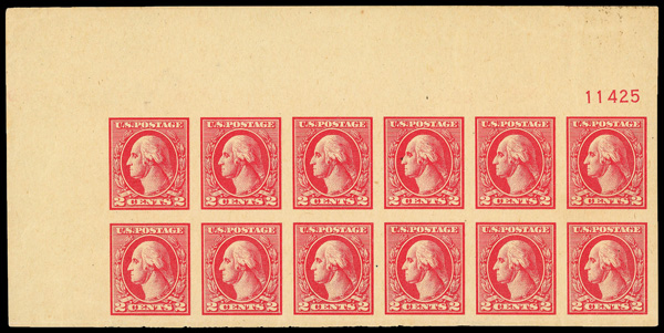 5308 nhbl 534 image1918, 2¢ carmine, type Va, offset printing, imperf. (Scott 534), top left corner margin block of 12 with plate number, o.g., never hinged (gum creases); creases, Extremely Fine to Superb, with 2018 P.S.E. certificate.