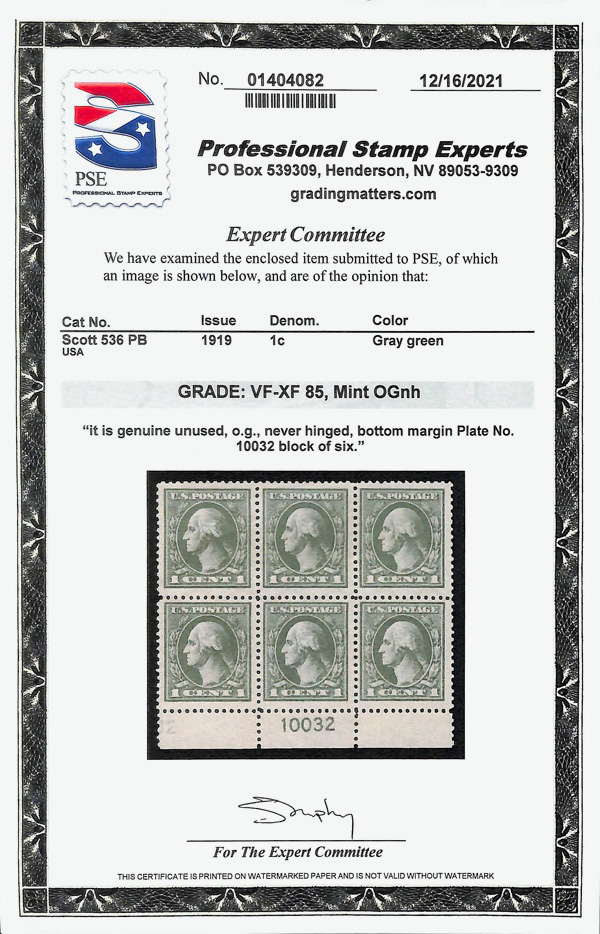 5312 nhbl 536 image1919, 1¢ gray green, offset printing, perf. 12½ (Scott 536), plate block of 6, o.g., never hinged (gum bends), Very Fine to Extremely Fine, with 2021 P.S.E. certificate graded VF-XF 85.