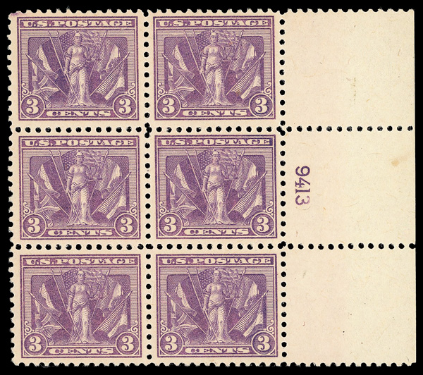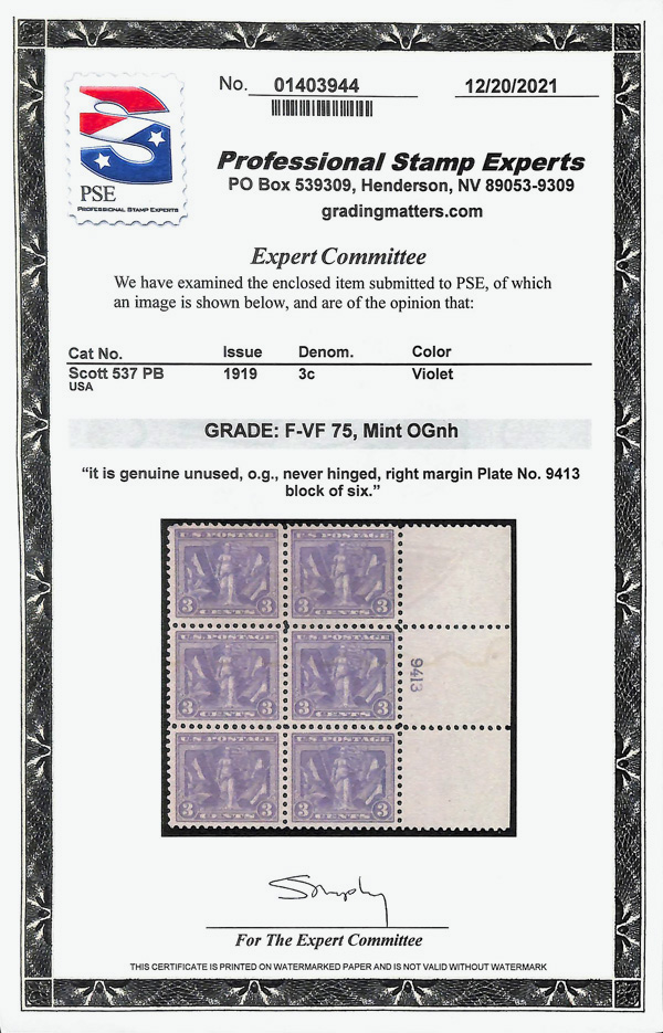 5314 nhbl 537 image1919, 3¢ Victory, violet (Scott 537), plate block of 6, o.g., never hinged, Very Fine, with 2021 P.S.E. certificate.