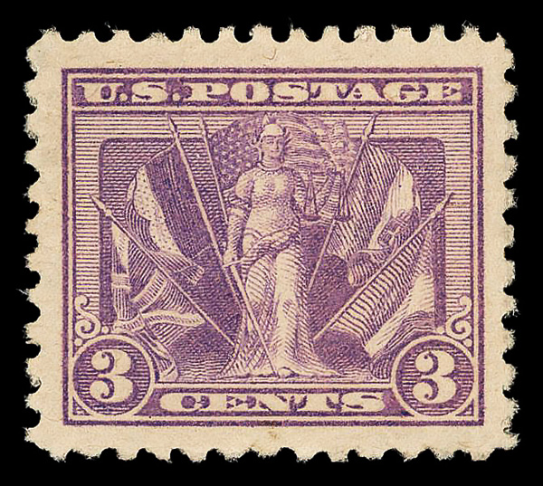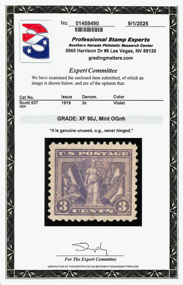 5313 nh 537 image1919, 3¢ Victory, violet (Scott 537), o.g., never hinged, jumbo margins, Extremely Fine, with 2025 P.S.E. certificate graded XF 90J.