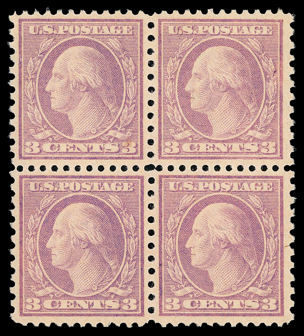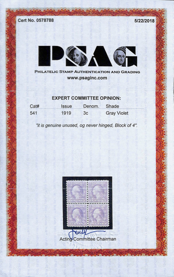 5318 nhbl 541 image1919, 3¢ violet, rotary press coil waste, type II, perf. 11 x 10 (Scott 541), block of 4, o.g., never hinged, Very Fine to Extremely Fine, with 2018 P.S.A.G. certificate.